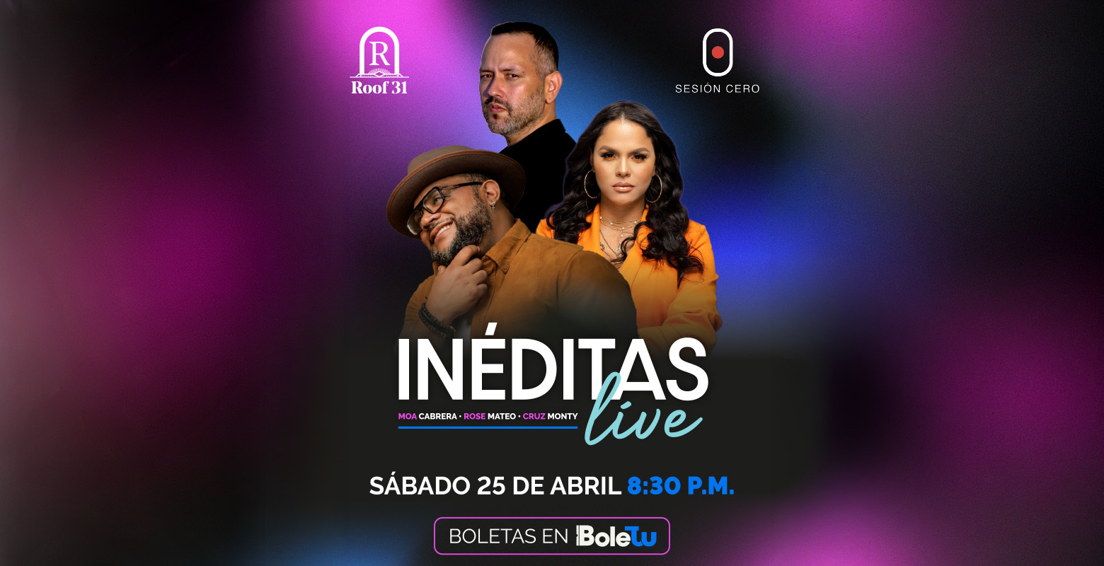 El concierto en vivo Inéditas Live con Moa Cabrera, Rose Mateo y Cruz Monty es un evento especial programado para el sábado 25 de Abril a las 8:30 PM en "Roof 31", un elegante espacio ubicado en el tercer nivel de la Avenida Benito Juárez no. 6, en el sector Villa Olga de Santiago de los Caballeros, República Dominicana.
